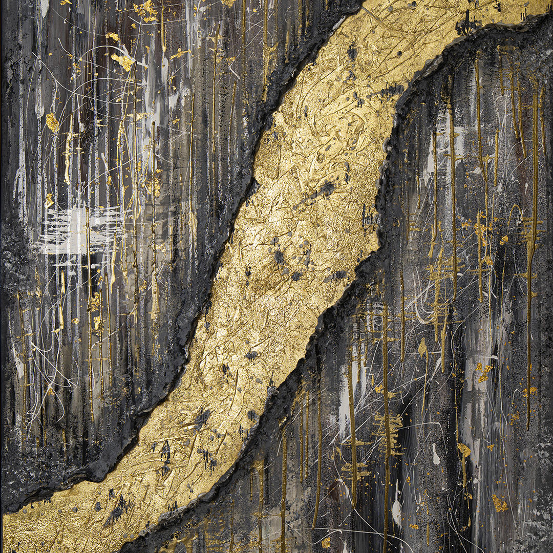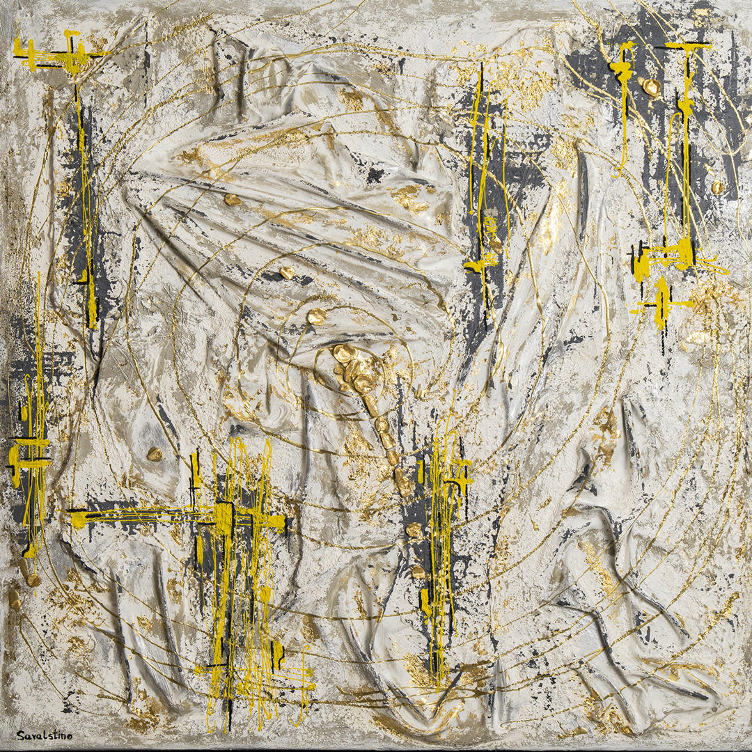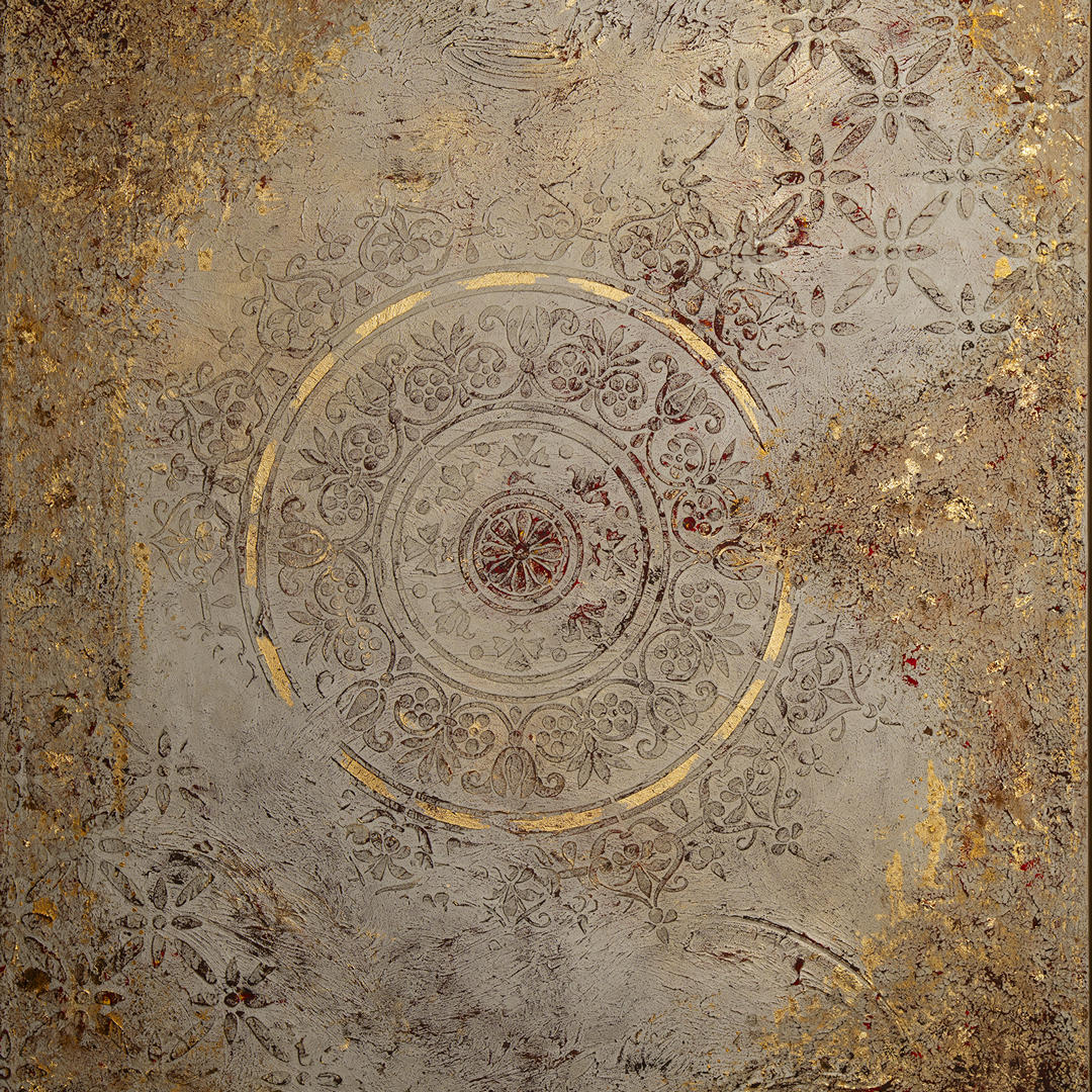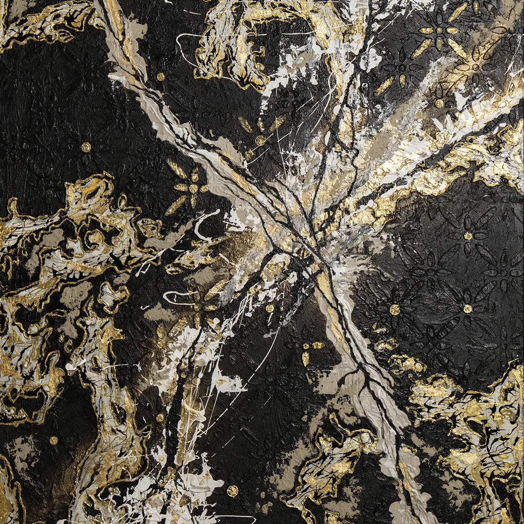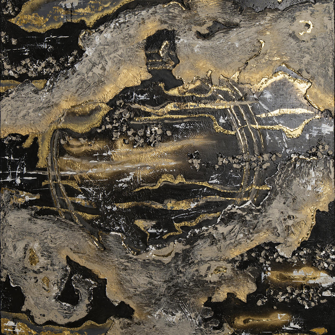 acrylic on canvas using oils, epoxy resin, fabrics, concrete, and gilding